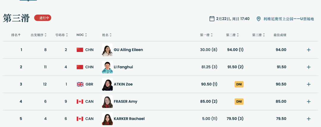 李方慧在随后也给中国观众带来惊喜!她不断提升自己的完成度,拿到91.50分来到第二!英国选手佐伊·阿特金此后一跳出现失误,在第二跳结束后,以第一跳90.50分的最高得分排在第三。